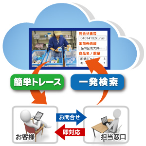 傷みや不良品質、数量不足などの納品先からのお問合わせにも、様々なキー項目(問合せ番号・日付・出荷先など)で、確認したい作業を一発検索し、迅速対応が可能になります。また、クラウドであるため外出先からでも作業映像を確認できます。